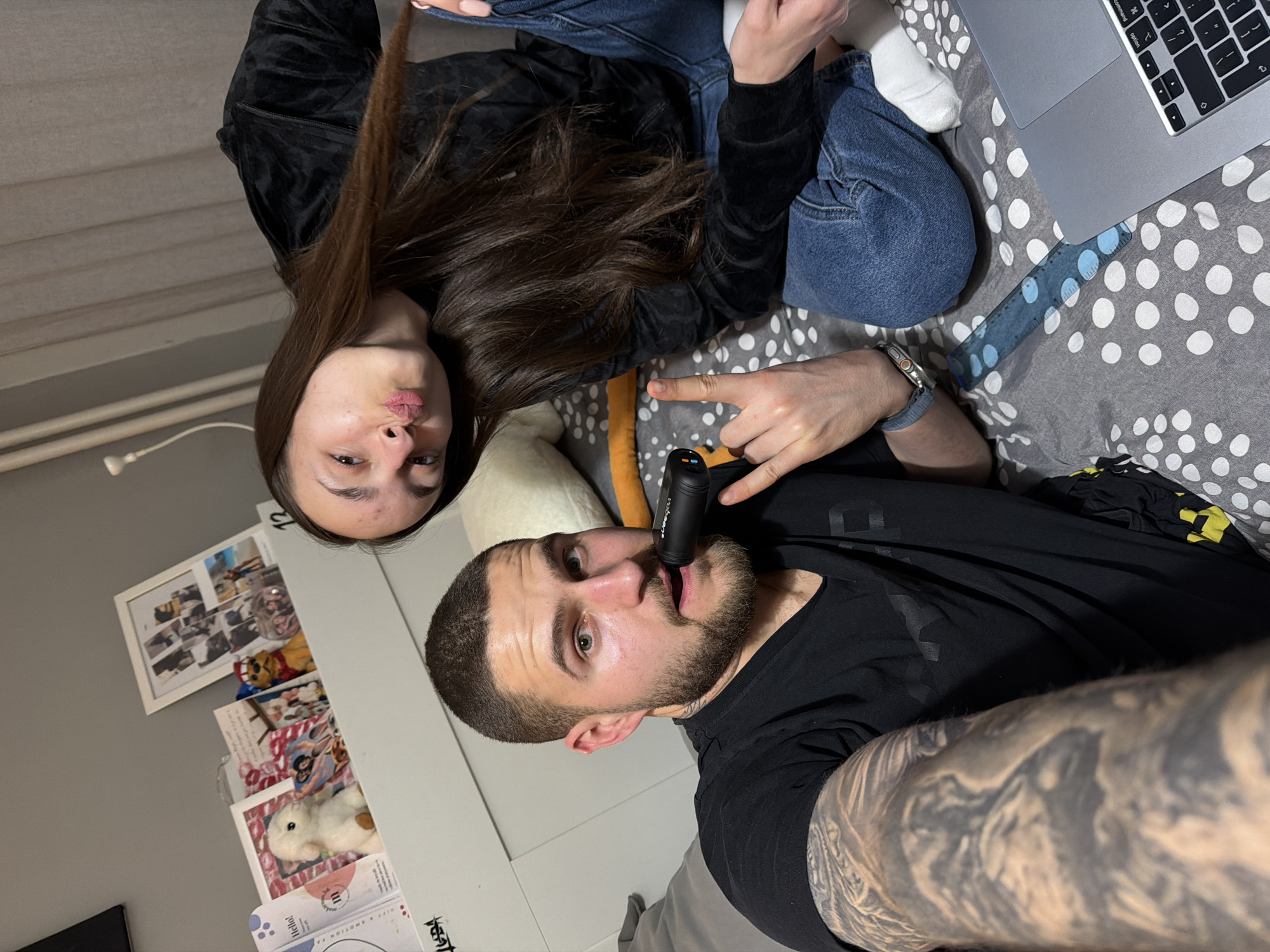 A selfie, taken at an indoor location likely a bedroom, depicts a man and a woman. The man is fair-skinned with a shaved head and a dark beard. He is wearing a black t-shirt and has visible tattoos on his left arm. He holds a black, cylindrical object up to his mouth, between his lips. He looks directly at the camera with a surprised expression, and his right hand is raised, gesturing the peace sign. Beside him, a fair-skinned woman with long, brown hair looks at the camera. She wears a dark, velvet top and blue jeans. Her feet are in white socks. They both appear to be on a bed. A laptop sits on the bedspread, which is patterned with grey and white dots and blue stripes. Near the woman, a white pillow can be seen. Part of the scene is a wall with framed pictures and greeting cards. Given the orientation of the photograph, the individuals may be lying on their side. No specific clues indicate the location being Sofia, Bulgaria.