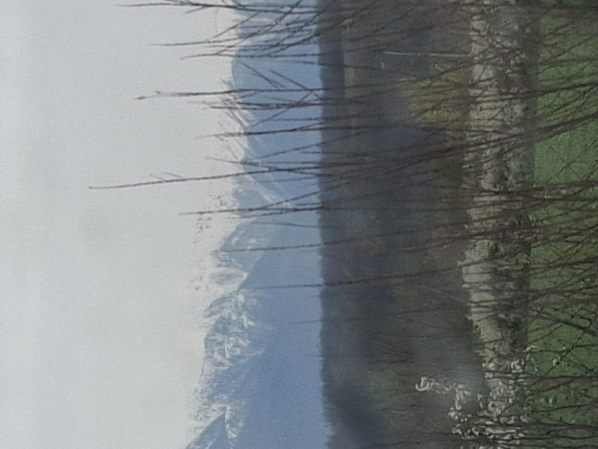 landscape in Borovtsi, Bulgaria, likely taken from an elevated position. In the background, snow-capped mountains are visible under a cloudy sky. A body of water (possibly a lake or river) extends from the mountains towards the midground. Foreground details include green vegetation on the right and bare branches of trees framing the view, creating a sense of depth.