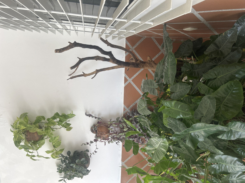 This image presents a well-lit residential space, likely a balcony or enclosed patio. The upper portion of the wall is smooth white, while the lower section features a terracotta-colored tiled surface with diagonal white grout lines. Three potted plants are affixed to the white wall: 1. Top left: A variegated pothos with mottled green and pale yellow leaves, cascading from a ribbed, light brown ceramic pot. 2. Mid-left: A compact, dark green leafy plant in a matching ribbed, light brown ceramic pot. 3. Mid-center: A plant with elongated, striped green and purple leaves, trailing downwards from another ribbed, light brown ceramic pot. The foreground is densely occupied by large-leafed green plants, appearing to be various Philodendron species, with prominent, dark green, ovate to heart-shaped leaves. Interspersed among these plants, positioned to the right, is a tall, leafless, multi-branched dark brown wooden branch, standing vertically. On the far right of the frame, a window fitted with white horizontal venetian blinds is visible, with the blinds partially open. The area is illuminated by bright, diffused natural light. No individuals are present, and no actions or interactions are depicted. The specific location within San Diego, Venezuela, is not discernible from the visual evidence in the image.