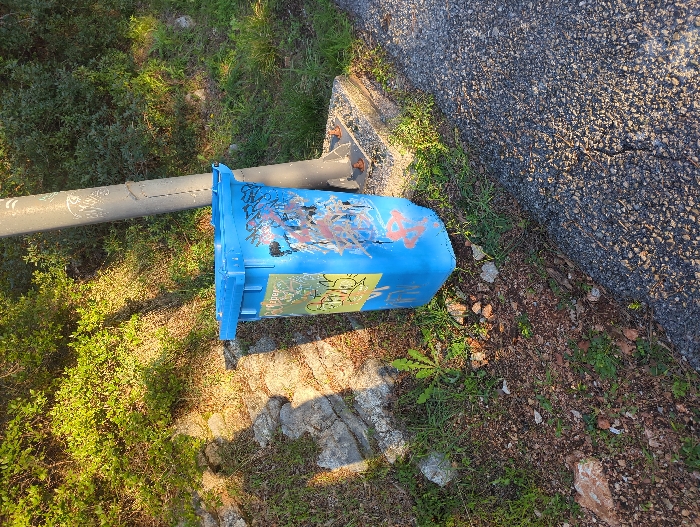 The scene depicts a blue plastic waste bin with a light blue lid positioned at the edge of an asphalt surface, likely a road or path, in Mirište, Montenegro. The bin is heavily marked with multicolored graffiti, predominantly on its front and right side, featuring abstract designs and partial text. A yellow sticker, partially obscured by graffiti, is visible on the bin's front. Adjacent to the bin, a grey metal pole, possibly a utility or light pole, rises vertically from a concrete base. This pole also bears some white markings or graffiti. The ground immediately surrounding the bin and pole consists of reddish-brown soil, scattered small rocks, and sparse green vegetation. Behind these objects, a verdant embankment covered with dense green bushes and foliage slopes upwards. Natural sunlight illuminates the scene, casting shadows, including a partial human-like shadow on the embankment to the left. No individuals or active interactions are observed.