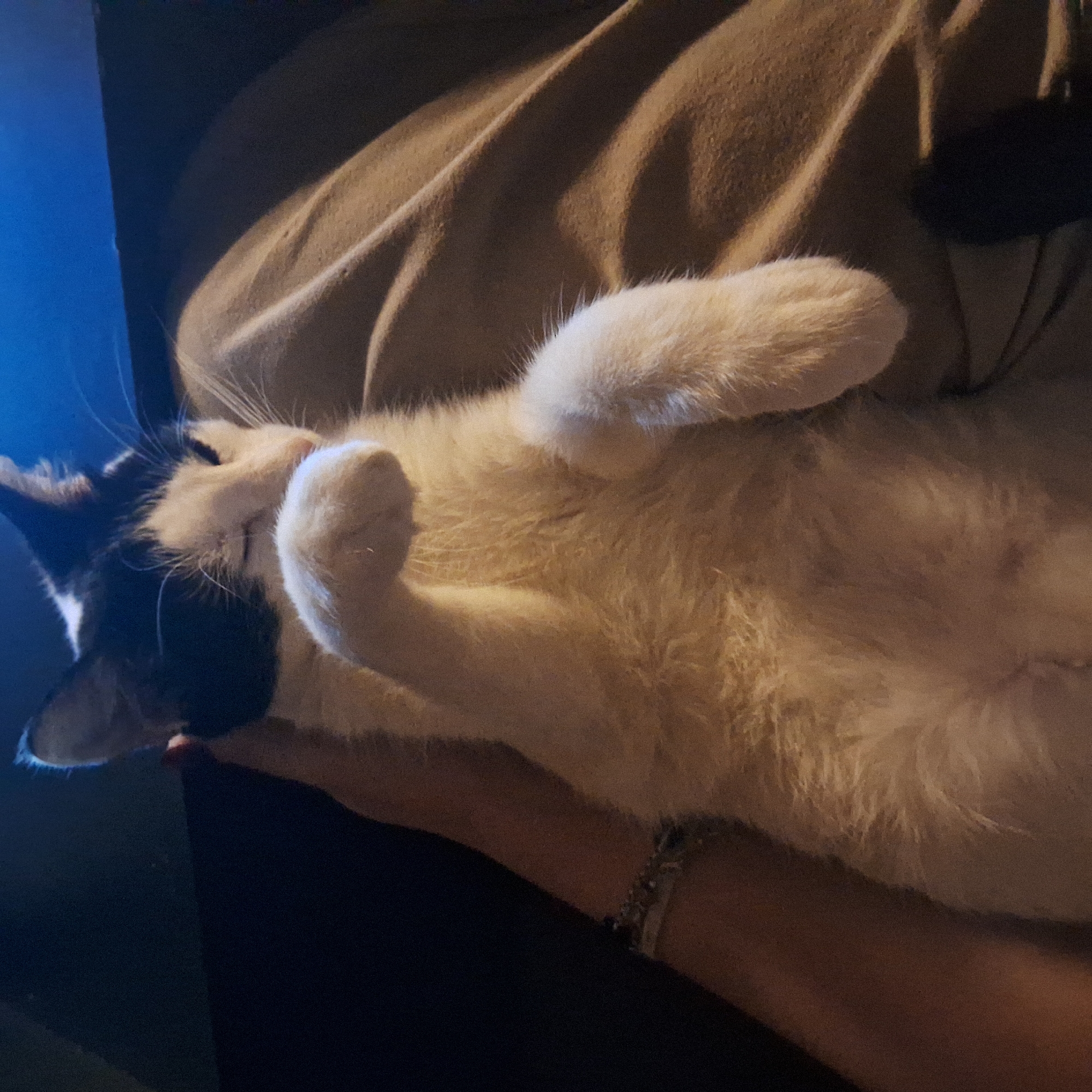 - "A bicolored cat, predominantly white with black markings on its head and ears, is positioned belly-up on a person's lap or arm" by FM-6OP392, licensed under CC BY 4.0