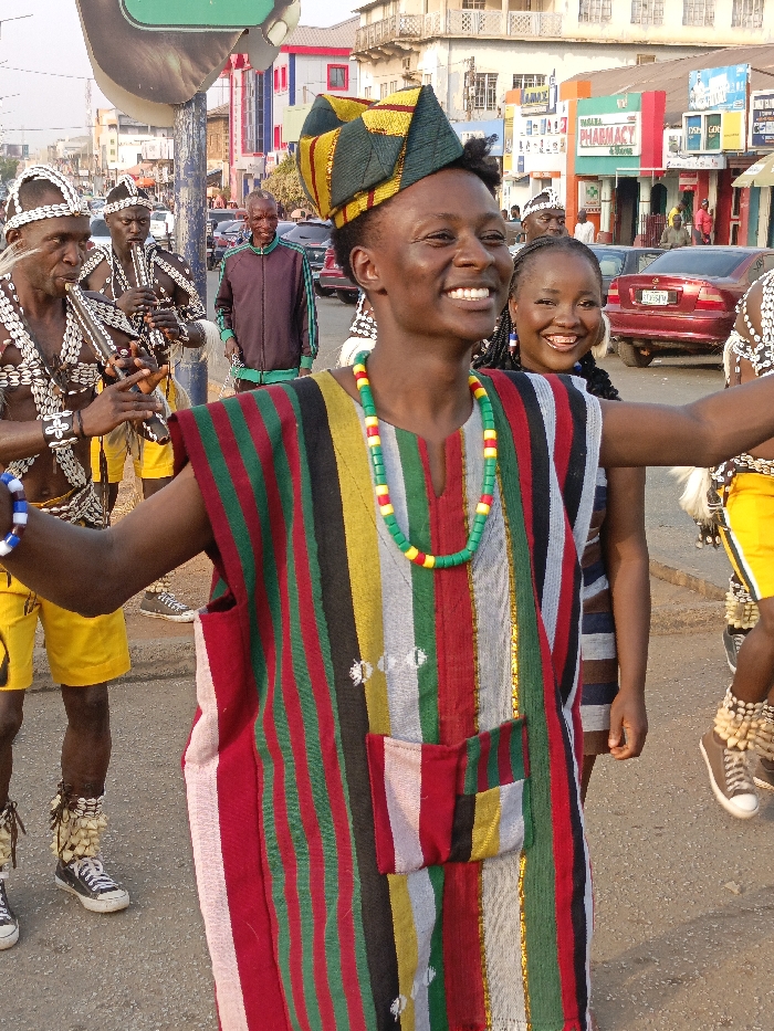 A vibrant street scene features a smiling person in a colorful striped tunic and distinctive hat, with arms outstretched