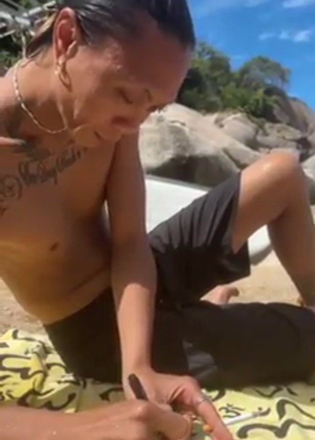 An individual with slicked-back dark hair and tattoos is sitting shirtless on a yellow patterned blanket at the beach, writing in a notebook with a black pen. The person is wearing black shorts, a silver necklace, and a ring on their right hand. The background shows a sunny blue sky, a beach with light-colored sand, and some rocks and vegetation.