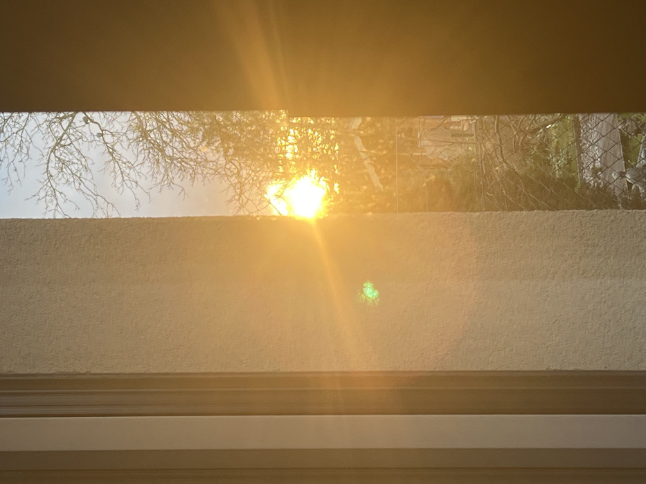 The image displays an exterior scene viewed through a narrow, vertical opening, likely a partially open door or window, framed by interior architectural elements. On the left, a vertical white window/door frame with molding is visible, adjacent to a textured, beige wall surface. On the right, a darker, solid wall or door jamb forms the opposite boundary. Intense golden sunlight enters from the upper right of the exterior view, creating significant lens flare, including a prominent green artifact on the left beige wall. Outside, a bright sun is low in the sky, silhouetting numerous bare tree branches against a pale sky that transitions to an orange glow. Two small, dark birds are perched on a higher branch in the center. Below the trees, a chain-link fence runs horizontally across the middle ground. Further back, a light-colored building with a roof is partially visible. At ground level, green vegetation and a dark, possibly metallic, ornamental object are discernible. No human subjects are present. The scene is located in the city of Foetz, Luxembourg.