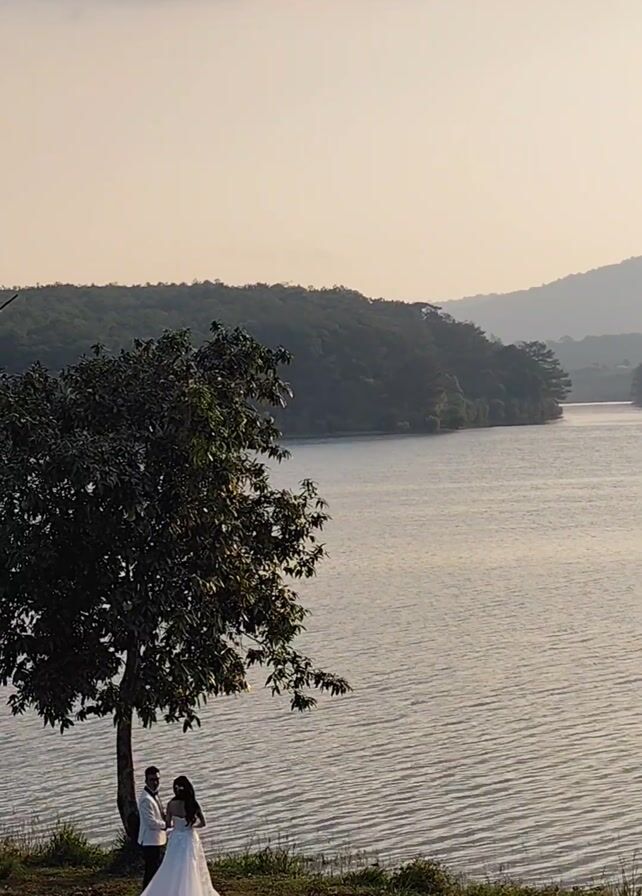 A couple is standing underneath a tree on a grassy embankment by a large body of water. A photographer is kneeling on the ground in front of them, presumably taking photos. The body of water is calm with gentle ripples. On the opposite side of the water are rolling hills covered with trees. The sky is overcast.