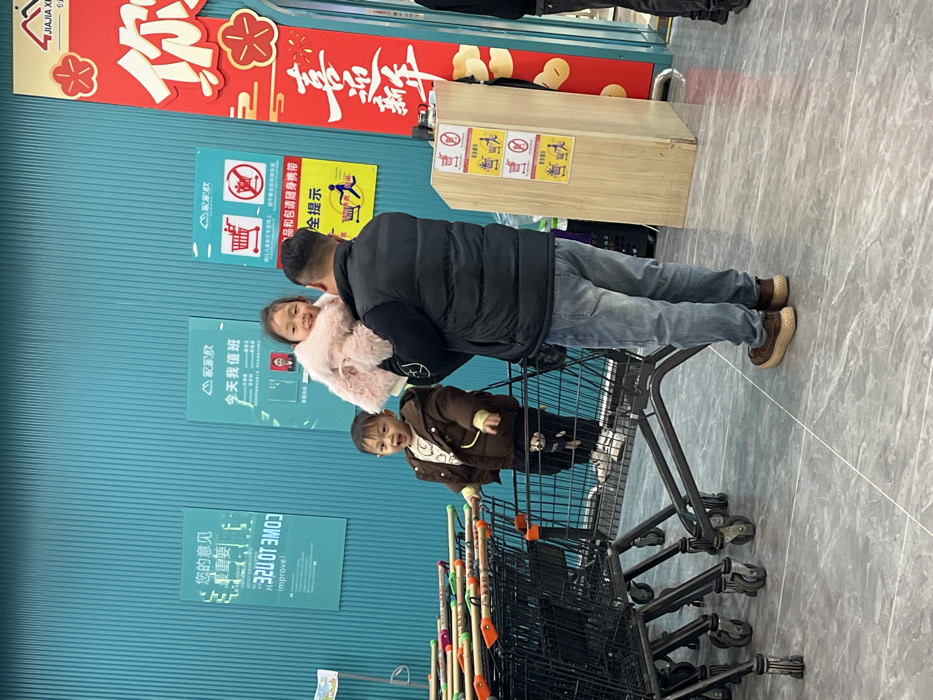 An indoor scene in a retail establishment, likely a supermarket, in Jiangjin, China, features an adult male with two young children near a stack of shopping carts