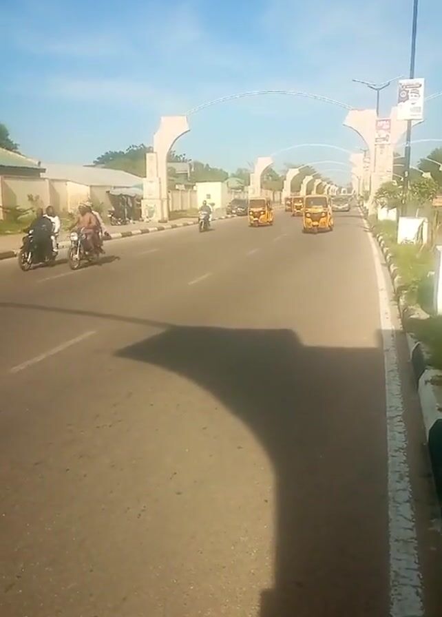 sunny day on a road with a series of arched structures spanning across it. Several yellow auto-rickshaws, also known as "keke" or "tuk-tuk," are moving along the road. Two motorcycles are also visible. Buildings and greenery line the side of the road. The video is taken from a moving vehicle.