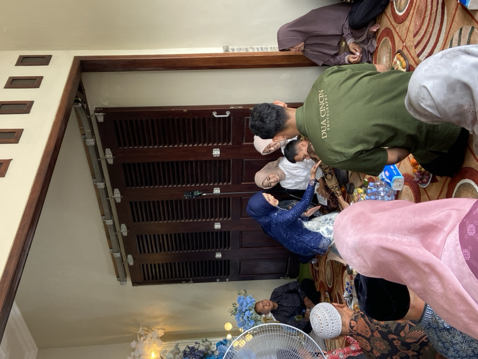 A family gathering indoors. A group is gathered around a person in blue, seemingly an event is taking place. Adults in hijabs are present, along with men in traditional attire. A man in green stands, possibly taking photographs. Decorated folding doors line the wall. A ceiling fan, floral decorations, and various objects scattered on the carpeted floor are also present. The image appears to be taken from an angle.