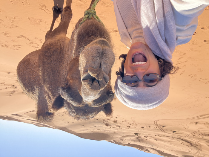 An adult female and a dromedary camel are captured in a selfie-style photograph taken in a desert environment near Rissani, Morocco