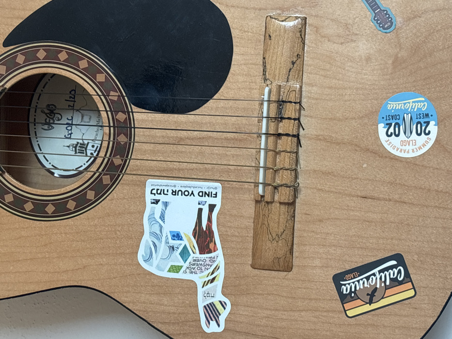 This image depicts a close-up, overhead view of the upper body of an acoustic classical guitar. The guitar features a light-colored wooden top, a decorative rosette around the soundhole with concentric patterns, and a black, tear-drop shaped pickguard. Six strings, characteristic of a classical guitar with wound bass strings and plain treble strings, extend from above the soundhole over a light-colored wooden bridge and a white saddle. The bridge shows minor discoloration and wear. Inside the soundhole, a white label is visible, reading "Vega," displaying a graphic of a building (possibly a church or lighthouse with a cross), "G.O.C. 12/20," and "Paracho Michoacan Mexico," indicating the instrument's manufacturing origin. Several stickers are adhered to the guitar's body: a stylized llama-shaped sticker with mosaic patterns and the text "FIND YOUR למה" (Lama), along with social media handles; a rectangular "California - ELAGO" sticker featuring a sunset and bird; and a circular blue and white sticker stating "SUMMER PARADISE ELAGO 2002 WEST COAST California" with surfboard graphics. A small blue guitar-shaped sticker is also present at the bottom right. No individuals are present. The background is an indistinct, light-colored surface. While the guitar originates from Paracho, Michoacán, Mexico, the specific current location of the instrument within Interlomas, Mexico, is not discernible from the visual evidence provided in the image.