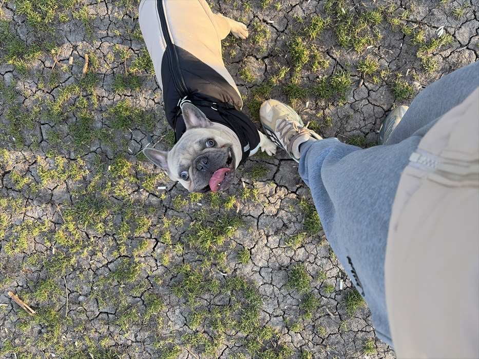 - "An overhead view captures a fawn and white French Bulldog looking upwards with its tongue extended, standing on dry, cracked earth with sparse green grass, located in Burgas, Bulgaria" by FM-TXVkP2, licensed under CC BY 4.0