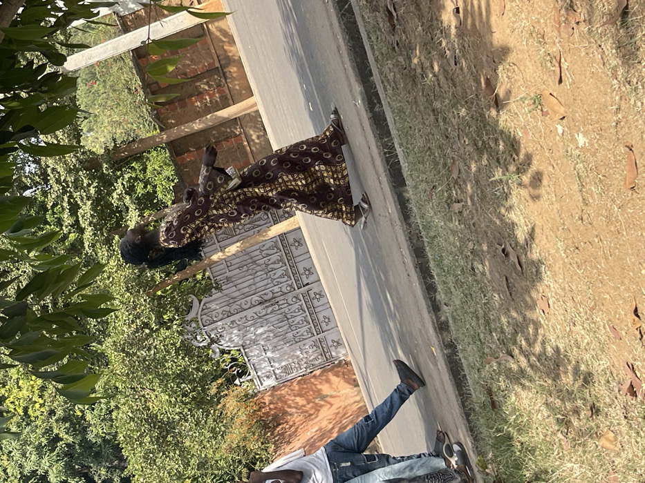 In Hanwa, Nigeria, a daylight scene depicts multiple individuals near a paved road with a visible curb and a grassy verge. The primary subject is a woman with dark skin and braided hair, wearing a long-sleeved, ankle-length dark brown gown with light brown/gold patterns and light-colored sandals. She is in motion, walking left-to-right across the frame, with her head tilted upwards and her right arm slightly raised. A light-colored object, possibly a small bag or phone, is visible near her left arm. To the left, partially visible individuals include one wearing a white t-shirt and patched blue jeans with dark shoes, and another whose lower legs are visible, wearing sandals. The background features a large, ornate grey metal gate with star and crescent moon designs, partially obscured by green foliage, and a reddish-brown brick wall. Lush green trees and vegetation dominate the upper and background portions of the image. A utility pole or tree trunk stands on the right side of the road. The ground consists of asphalt, a concrete curb, and a dirt/grass median with sparse vegetation and scattered dry leaves. The scene is brightly lit by natural sunlight, casting discernible shadows on the ground.