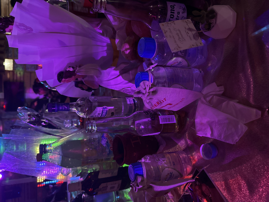 An array of objects sits under vibrant purple lighting. The scene includes several empty glass bottles of various shapes and sizes, some labeled “Corona”, “Donal”, and “Overit”. Water bottles with blue caps are also present. A small white potted plant and a card with elegant script lie among the bottles. Additional elements include a white fabric bouquet, and a brown ceramic pot. The items appear to be arranged on a reflective surface, possibly a table, adding depth to the composition.