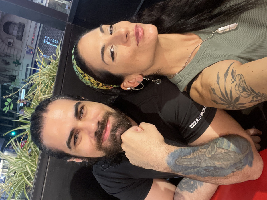 A selfie shows a man and a woman. The woman is wearing a green top and a patterned headband, with a silver necklace and multiple earrings. The man wears a black Billabong shirt and has dark hair and a beard. Both have tattoos; the woman on her upper arm and the man on his forearm. They are indoors, with a window showing street scenes and plants in the background. The composition is slightly rotated.