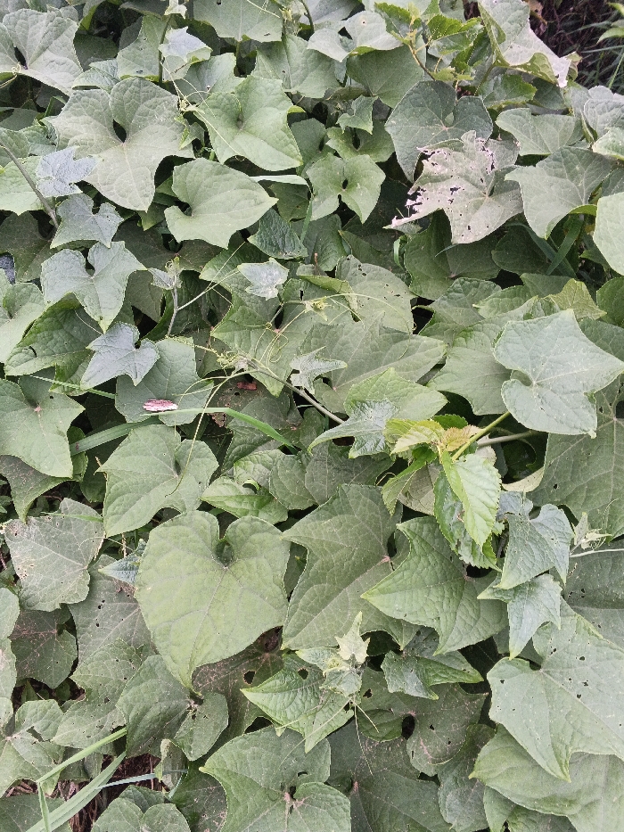 The image displays a dense, verdant ground cover of various plant foliage in Pinnwe, Myanmar. The primary subjects are numerous green leaves, predominantly broadly ovate to heart-shaped, consistent with vining plants such as gourds or squashes, with some exhibiting visible tendrils. The leaves show varying shades of green, from mature, darker leaves to lighter, younger growth. Several leaves display minor insect damage or holes. In the lower-central portion, a cluster of lighter green, serrated leaves from a distinct plant species is observable. A small, elongated object, approximately 1-2 centimeters in length, is situated horizontally on a thin blade of grass in the mid-left area. This object appears bicolored, with a light pinkish-white segment transitioning to a darker, possibly reddish-brown segment. The ground beneath the foliage is largely obscured. No people, animals, or artificial structures are visible. The scene is illuminated by natural light, indicating an outdoor environment.