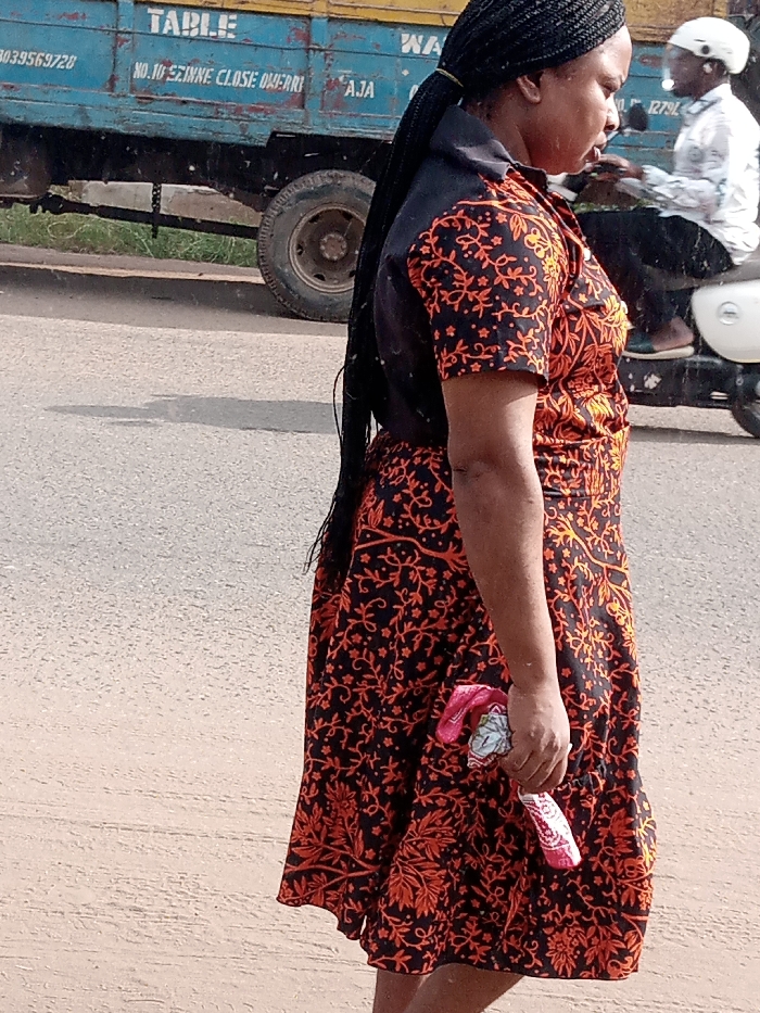 The image captures an outdoor urban scene on a clear day in Owerri, Imo State, Nigeria. An adult female, viewed from her right side and facing left, stands on a paved road. She has a dark complexion and long black braids styled into a ponytail. She is wearing a short-sleeved, collared dress predominantly black with an orange botanical pattern. In her right hand, she loosely holds a folded red and white patterned cloth. In the background, a light blue truck with yellow trim and white lettering, including "TABLE", "WA", "NO. 10 EZINNE CLOSE OWERRI AJA", and "08039569720", is partially visible. Further back and to the right, a person wearing a white helmet and white long-sleeved shirt is riding a white scooter or motorcycle in the same direction. A strip of green vegetation is visible behind the truck along the roadside. Shadows are present on the road surface.