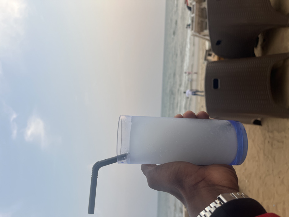 A hand holds a frosted glass filled with a white beverage and a black straw. In the background, the ocean stretches under a hazy sky. Beach chairs are visible on the right side of the frame. People are also seen near the water's edge. The person holding the glass wears a silver watch.
