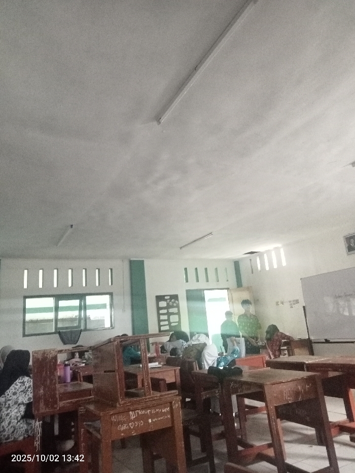 This image captures the interior of a classroom in Pacet, Indonesia, at 13:42 on October 2, 2025
