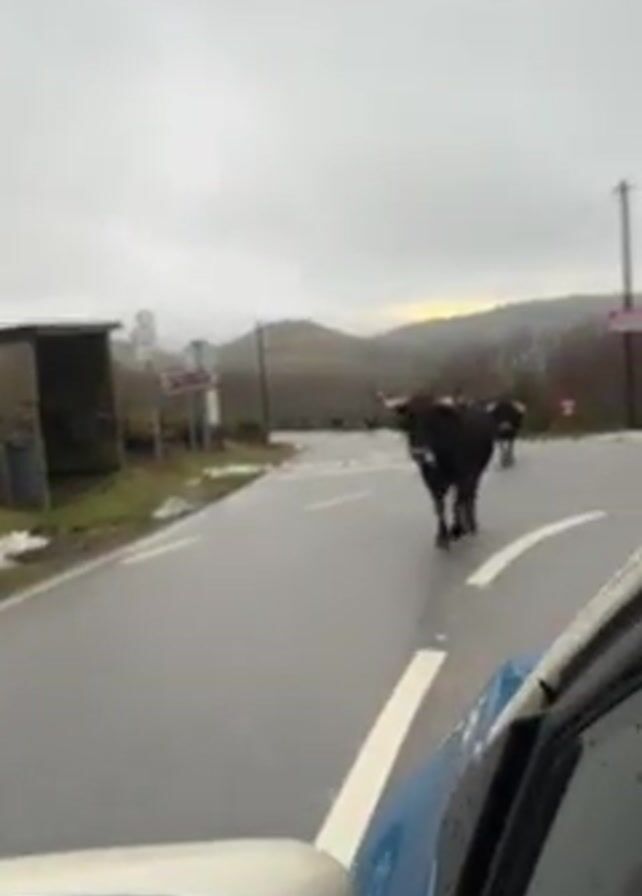 From the perspective of a blue car, several dark-colored cows are walking across a wet road in a rural area. A small stone building is to the left of the road. The sky is overcast. Hills are visible in the background.