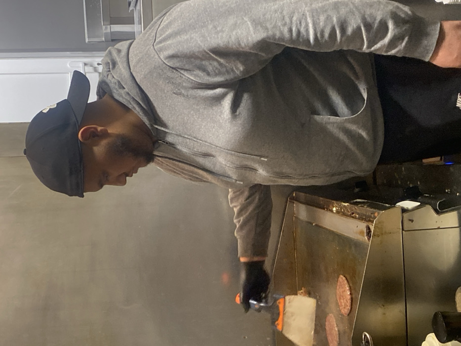 - "A person wearing a gray hooded sweatshirt and a black baseball cap is cooking burgers on a griddle" by FM-WEULP2, licensed under CC BY 4.0