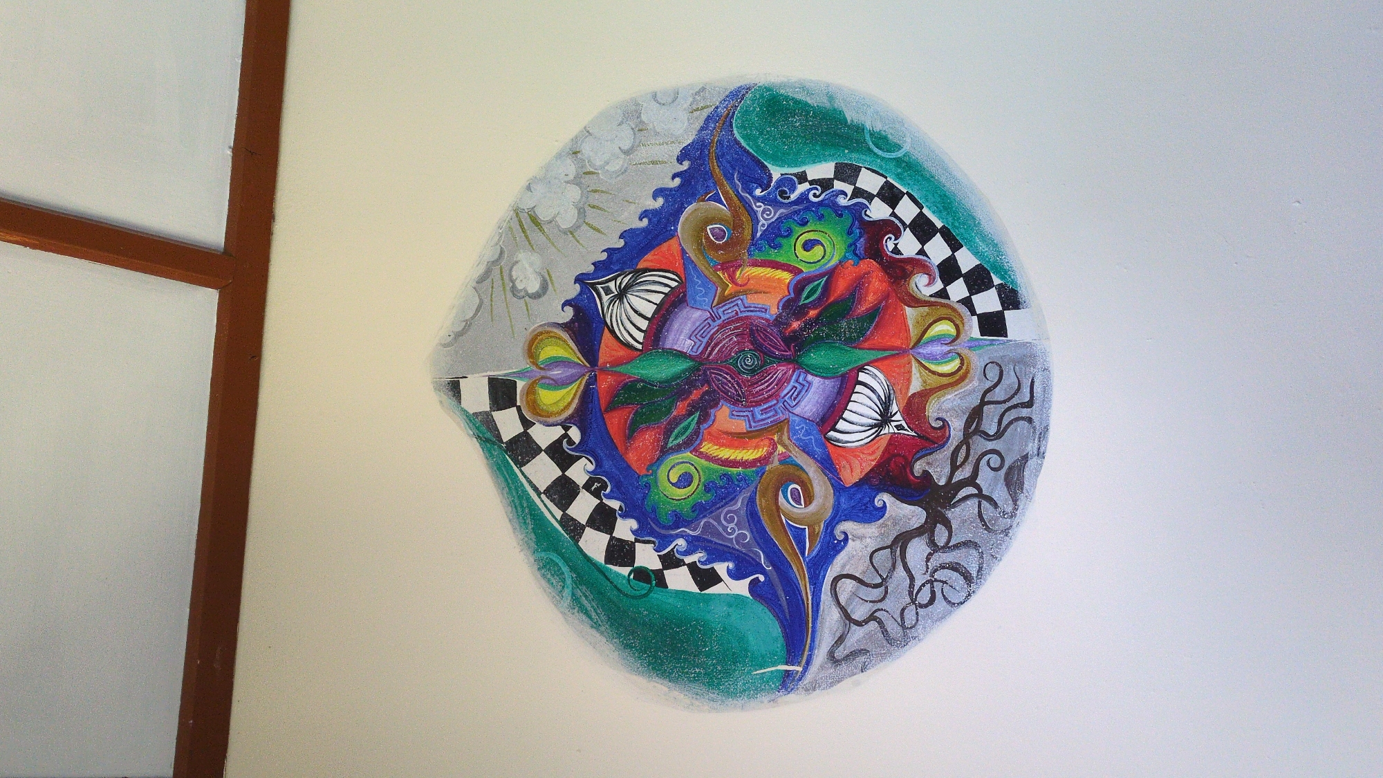 The image depicts a colorful, circular mural painted on a white wall