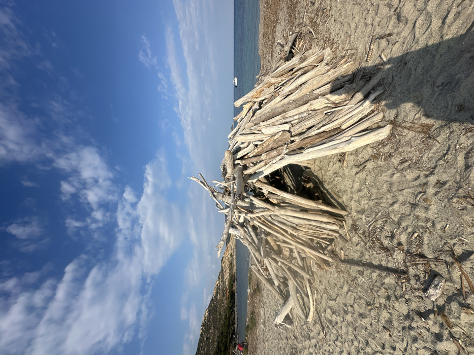 The image displays a conical, teepee-like structure constructed from numerous weathered driftwood pieces, varying in size and light to pale brown hues, situated on Plage de Gigaro in La Croix-Valmer, France