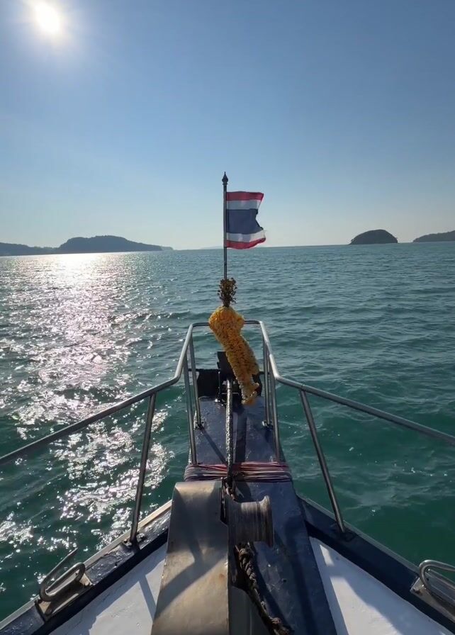 bow of a boat moving through calm, turquoise water on a sunny day. The Thai flag is mounted on a pole at the front of the boat, and a yellow flower garland is also attached to the pole. The sun glares on the water's surface. In the distance, there are a few small, hazy islands. The boat's anchor and some metal railing are visible in the foreground.