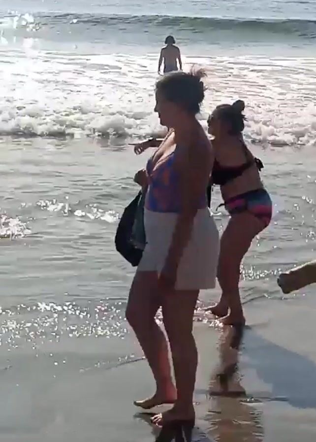 The video captures a sunny beach scene with several people enjoying the ocean. In the foreground, a woman in a colorful top and white shorts stands near the water's edge, while another woman behind her is taking pictures with her phone. A young girl in a pink top and shorts walks between them. To the right, a man wearing a dark shirt and orange shorts carries a piece of wood and a pink towel. The ocean is visible in the background with multiple people swimming and several boats in the distance. The waves are crashing gently on the shore, and the sand is dark. The overall atmosphere is relaxed and summery.