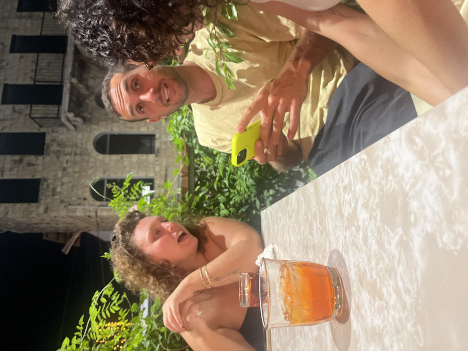 The image captures three individuals seated at an outdoor establishment at night in Haifa, Israel, specifically identifiable by the historic stone building with arched windows, dark shutters, and a balcony visible in the background, characteristic of areas like the German Colony. In the foreground, a light-colored, patterned table displays two drinks. Closest to the viewer, a clear glass holds an orange-colored beverage with ice. Further back, another clear glass contains a darker, reddish-brown liquid, also with ice, positioned near a crumpled white napkin. On the left, a female with curly light brown hair and fair skin, wearing a dark strapless top and two golden bracelets on her right wrist, is depicted with her mouth open, appearing to speak or laugh, looking towards the right side of the frame. Her right arm is bent with her hand near her shoulder. In the center, a male with short dark hair and a light beard wears a light yellow t-shirt and dark trousers. He holds a neon yellow-cased smartphone with both hands, looking down at it, but also has his head slightly raised and his mouth open, suggesting he is also engaged in conversation with the individuals around him. On the far right, only the side of a third individual's head, featuring curly dark hair, and a portion of their light-colored garment and arm are visible, positioned to the right of the central male. Lush green foliage with some small, indistinct lights is situated behind the individuals, adding to the outdoor ambiance. The scene is illuminated by artificial lighting, creating a warm glow that contrasts with the dark night sky and the dimly lit stone building.