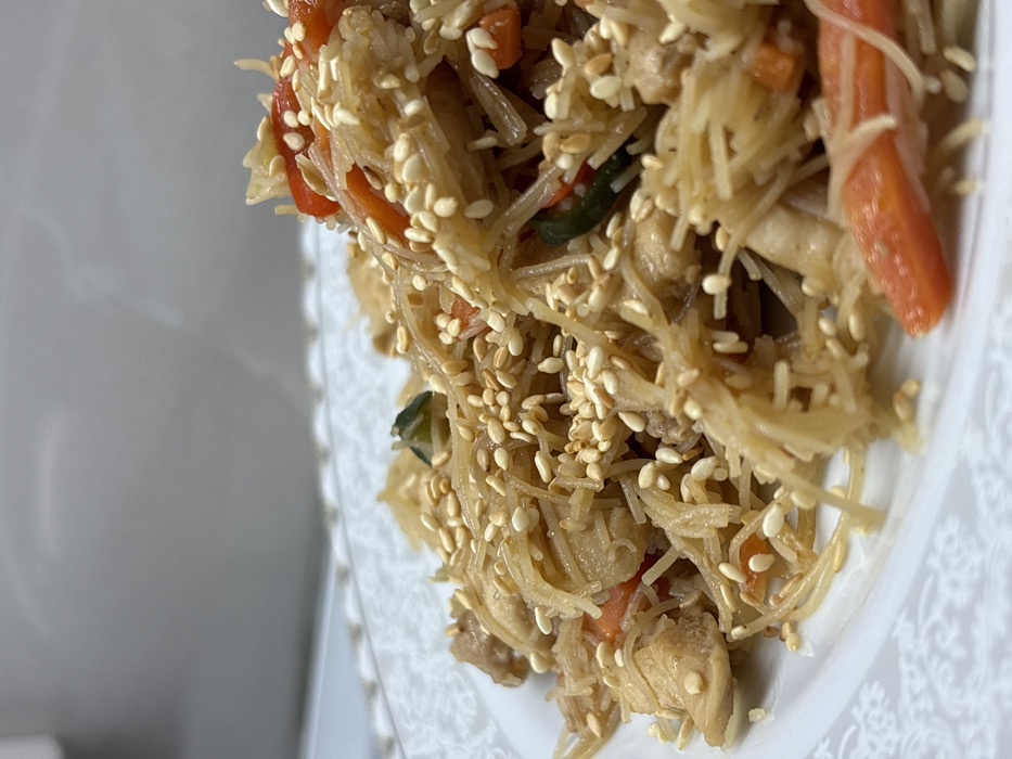 The image displays a close-up, elevated view of a prepared meal served on a white, circular plate with a subtle, greyish embossed or printed pattern along its rim. The dish consists of a stir-fried mixture featuring thin, light brown vermicelli-style noodles, irregular pieces of cooked chicken, sliced orange-red vegetables (likely carrots or bell peppers), and dark green vegetable fragments. A prominent topping of numerous toasted sesame seeds is scattered across the entire dish. The food appears to be coated in a light brown, glossy sauce. The background is uniformly blurred and light grey, providing no specific environmental details or objects. The location of the scene in Tbilisi, Georgia, cannot be determined from the visual information presented in the image.