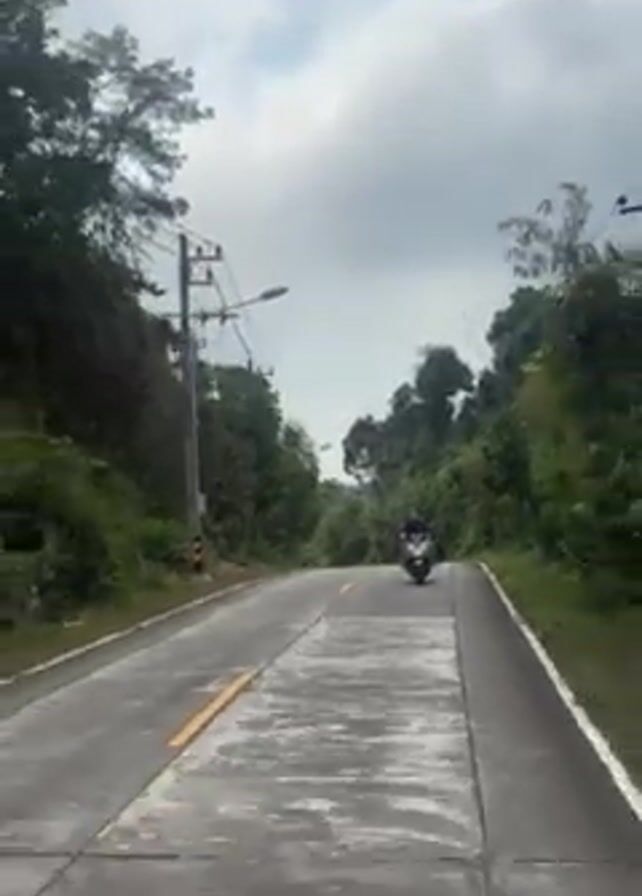 road in a lush, possibly tropical environment. The sky is overcast with thick clouds. The road is grey, divided by a yellow line, and flanked by trees and dense vegetation on both sides. Power lines and streetlights are visible alongside the road. The camera appears to be moving forward on the road, likely from a vehicle or motorcycle. Ahead, several motorcycles are traveling in the same direction. One motorcycle closer to the camera has a delivery container attached to the back. The road seems to be ascending, with the motorcycles moving uphill.