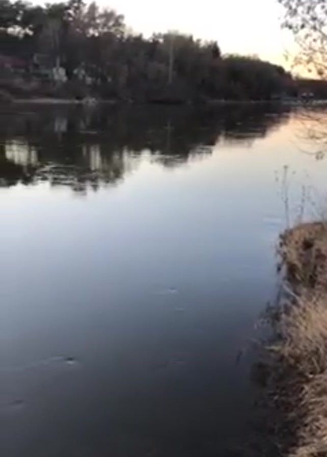 calm, dark river with trees lining both sides of the bank. The water reflects the trees and the sky above. The river current is flowing smoothly. The banks of the river are covered with dry grass. The sky is getting darker as the sun sets.