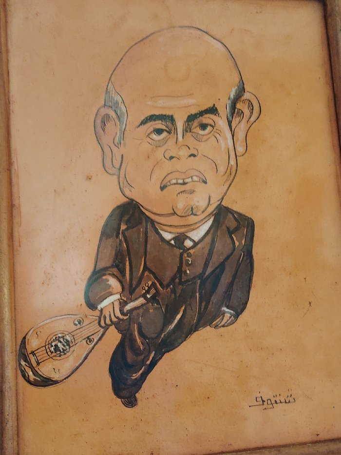 A caricature portrait depicts a bald man with large ears, dressed in a dark brown suit, white shirt, and tie. He holds a lute-like instrument. The artwork is rendered in brown tones on a textured background, framed with a simple wooden border. A signature is visible in the lower right corner in what appears to be Arabic script. The style is cartoonish with exaggerated features.