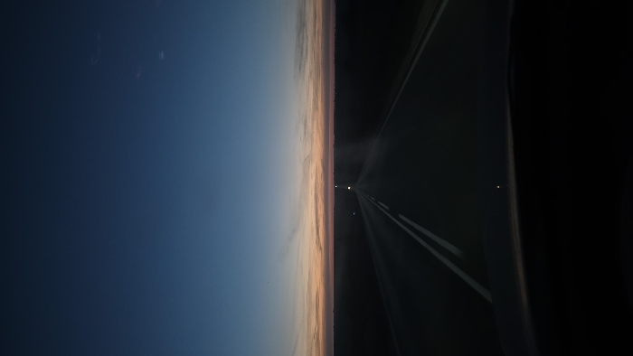The image displays a two-lane asphalt road extending into the distance under a twilight sky, captured from the interior perspective of a vehicle, near Kamenar, Bulgaria. The sky transitions from a deep blue overhead to a horizon band displaying hues of light blue, orange, pink, and pale yellow, indicative of dawn or dusk. Faint, linear cloud formations are discernible within the colored horizon band. The road features solid double white lines marking its center, converging towards a vanishing point in the far distance. Multiple distinct white light sources, consistent with distant vehicle headlights, are visible along the road ahead, with a prominent cluster centrally located. The immediate foreground shows the dark, curved upper edge of a vehicle's dashboard. The terrain flanking the road on both sides appears dark and indistinct, suggesting an open, rural environment under low ambient light conditions.