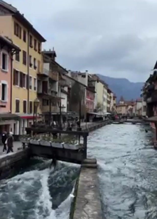 European town with a river running through it. The buildings on either side of the river are tall and colorful, with balconies and windows. The river is flowing quickly, and there are some rapids. People are walking along the sidewalks on either side of the river. The sky is cloudy, and there are mountains in the distance.