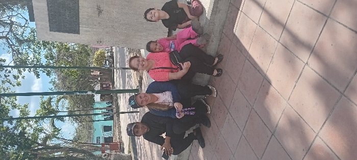 A group of six people are sitting together. The composition is a mix of adults and children. An older woman with glasses is centrally positioned. Two young girls are nestled beside her. Two younger adults are on the lower level. One child sits at the top, next to a concrete slab. The setting appears to be an outdoor plaza with trees and buildings visible in the background, with sun shining on the group.