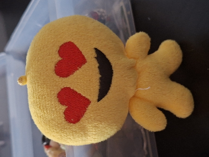 The scene, located in the city of Selyanin, Bulgaria, displays a single yellow plush toy. The toy, approximately 10-12 cm in height, features a round head and a simplified body with four short, rounded limb-like protrusions. Its surface is composed of a soft, short-pile yellow fabric. The face consists of two red, embroidered heart shapes for eyes and a black, embroidered crescent shape representing a smile. A small, textured, yellowish fabric loop is centrally attached to the top of its head. A single loose white thread is visible hanging from the junction between the toy's head and body. The toy stands upright on a dark, flat, non-reflective surface. In the background, a translucent, light-blue plastic storage container is partially visible, containing indistinct items within its left side. No individuals are present, and no actions or interactions are depicted in this static arrangement.