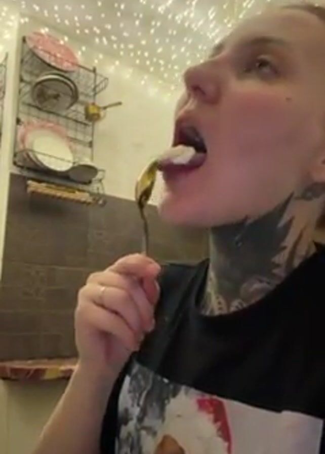 A person with fair skin, a black t-shirt with a holiday graphic of a figure in a red and white Santa hat, and tattoos on their neck is seen in a close-up shot against a background of a wall of dark tile, a wire shelf holding dishes, and a ceiling covered with fairy lights. The person puts a golden spoon into their mouth, removes it, and then looks directly at the camera, smiling slightly. Music plays in the background.