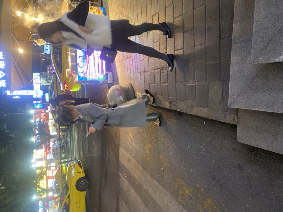 Two women stand on a city street at night. One wears a black jacket, white fur vest, black tights, and black shoes. The other wears a gray coat and black shoes with a fur trim. They are standing on a paved sidewalk near a street with yellow taxis. A food stall illuminated by neon lights is visible in the background. Buildings with lit-up signs are on the left side of the image. A trash can sits between the women.