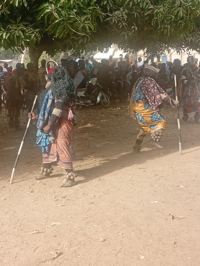 two individuals in elaborate, colorful costumes dancing in a dirt area. They are surrounded by a crowd of people, many of whom are seated and observing. The individuals are wearing traditional Nigerian attire, including a long, flowing gown and head coverings. They are both holding sticks and moving rhythmically. The environment is a rural area with a large tree in the background, which provides shade for some of the spectators. The ground is dusty and there are a few scattered pieces of debris. The image was taken in Gundzhe, Nigeria, which is located at latitude 8.981 and longitude 8.395. The scene appears to be a traditional Nigerian cultural event.