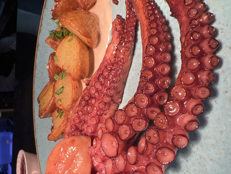 A close-up shot features a plate with cooked octopus tentacles and fried potatoes
