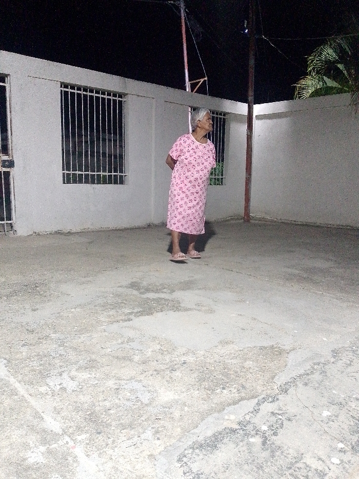 An elderly woman in a pink patterned dress stands in a concrete courtyard at night. She has short grey hair and is wearing sandals. Her hands are behind her back, and she appears to be looking up and to the right. Behind her is a low, white building with barred windows. A utility pole stands to her right, and vegetation is visible in the upper right corner. The ground is rough and uneven.