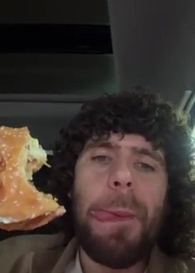 A man with curly brown hair and a beard, wearing a tan jacket, holds a partially eaten hamburger in front of his face. He's sticking his tongue out slightly. The background appears to be the interior of a car, with a sunroof visible. Music is playing.