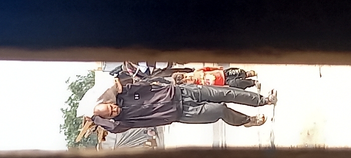 The image depicts a sunlit outdoor scene in Khan Yunis, Palestinian Territory, viewed through a narrow, dark vertical opening. An adult male, bald and with a mustache, walks towards the viewer, carrying a large, light-colored bundle, possibly a sack over wooden pieces, on his left shoulder. He wears a dark grey hooded jacket with a white emblem on the chest, dark grey track pants, and light-colored sandals. A young child, wearing a red long-sleeved shirt with a light graphic and dark pants, walks directly behind him and slightly to his right. The ground is light-colored and uneven. In the left mid-ground, a large, light-colored tent or tarp structure is visible, with a blurry human figure seated nearby. Green foliage is present in the upper distant background against a bright sky.