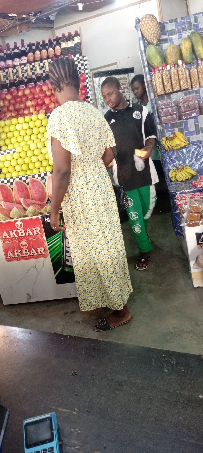 An indoor retail stall in Aviation Quarters, Nigeria, features three individuals amidst displays of fresh produce and packaged goods. In the foreground, an adult female with braided hair, wearing a yellow floral maxi dress and dark slides, stands facing away from the camera, observing items on a lower display. A black studded shoulder bag hangs on her left side. To her right, a young adult male, wearing a black and white "Newcastle" polo shirt, green trousers with white logos, and dark sandals, holds a small, light-colored wrapped item in his right hand. An earbud is visible in his left ear. Partially visible behind him is a second male youth in a light shirt. The stall's left section displays rows of red and green apples stacked in a tiered arrangement. Above the apples are shelves with dark bottles, some labeled "EXCEL," and others containing dark liquids, set against a black and white checkered background. Below the apples, slices of watermelon are arranged, with red "AKBAR PREMIUM QUALITY TEA" boxes positioned in front. The right section features a large pineapple, several papayas, clear plastic bottles filled with nuts, and clear plastic punnets containing red berries. Bunches of bananas are displayed on a blue and white patterned surface, likely covering stacked packaged goods. The floor is a dark concrete surface. In the immediate foreground, a partial view of a dark counter reveals a light blue point-of-sale device. The ceiling shows exposed wiring and a single light fixture.
