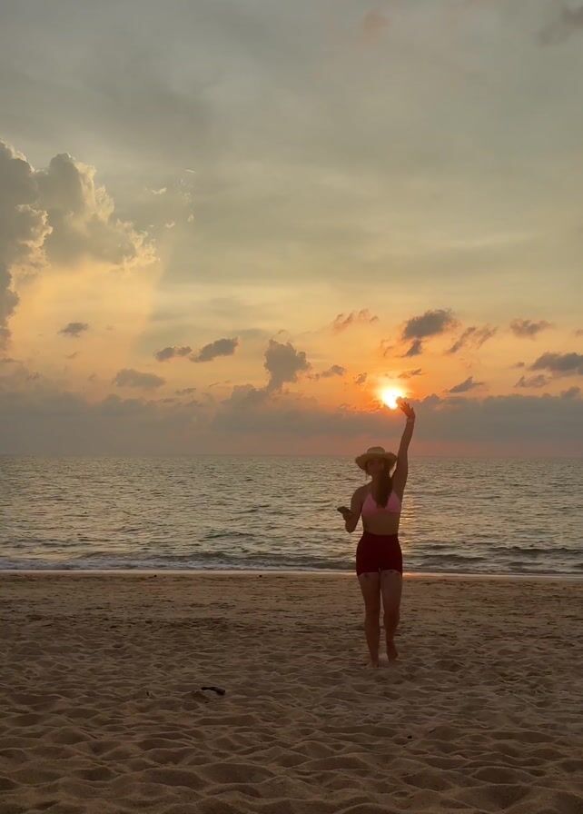 A young woman in a pink bikini top, dark red shorts, and a straw hat is walking on a sandy beach during sunset. The sun is setting over the ocean in the background, casting an orange glow on the sky and clouds. She is holding a cell phone and occasionally raises her arm. She walks toward the camera and out of the frame.