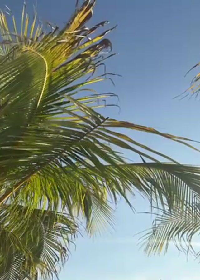 close-up view of palm tree fronds against a clear blue sky. Some of the fronds are green while others are dry and brown. The camera is static and there are no people visible. The overall setting suggests a tropical or coastal environment.