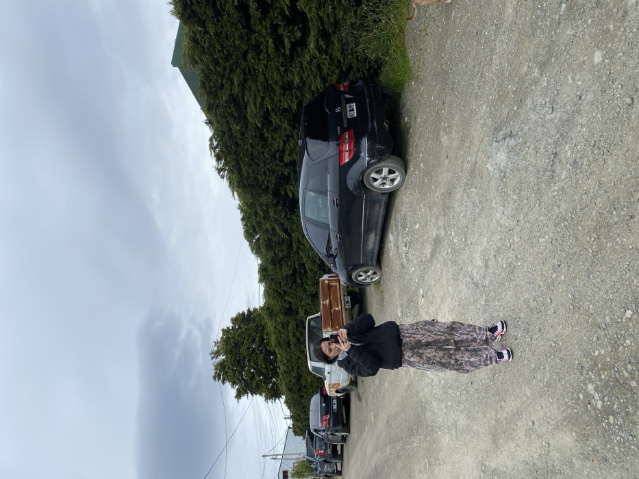 A woman in camouflage pants and a black jacket stands on a gravel lot, taking a photo with her phone. Behind her are several parked vehicles, including a black SUV and a rusty pickup truck. A tall hedge borders the lot on one side. The sky is overcast and gray.