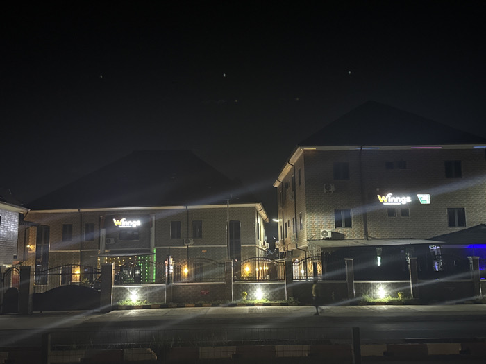 Two buildings are displayed at night, identified by "Winngs" signs