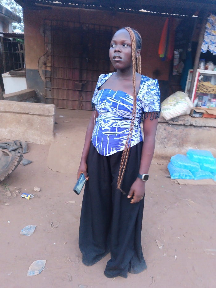 A young woman stands in a dirt yard wearing a blue and white patterned top with beaded sleeves and wide-legged black pants